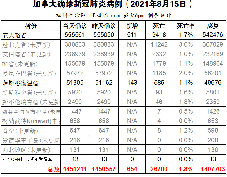 【加国生活网编译报道】截至2021年8月15日下午6点,加拿大新冠确诊病例总数为1451211(新增654),死亡26700(新增0)。安省确诊总数555561(新增511);萨省确诊总数51305(新增143),其余省份逢周末均未更新。随着BC省进入“第四波”疫情,BC省一些家长、教育工作者和学生在温哥华美术馆集会,要求BC省卫生部在儿童重返学校时能更好地保护他们免受新冠病毒的侵害;安省连续第五天新增病例超过500例,七天日均新增确诊人数为428例,比上周日的261例显著增加。加国生活网专门制作了如下统计数据表: