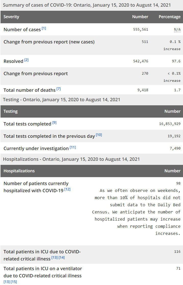 再看看安省方面的详细数据,截止8月14日,安省已对16,853,929例进行了新冠病毒检测(检测数较昨天新增19,192),还有7,490处于被调查阶段。确诊总数555,561(当天新增511;阳性率上升至2.66%),包括542,476例康复(康复率下降为97.6%)、9,418例死亡(新增0例,死亡率仍为1.7%)。住院患者98例(减少38,周末有10%医院没有更新数据);进入ICU患者116例(增加5);IU插呼吸机患者71例(减少1)。