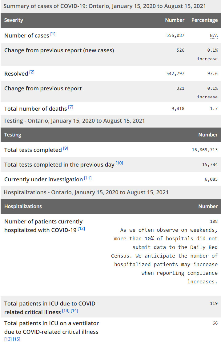 再看看安省方面的详细数据,截止8月15日,安省已对16,869,713例进行了新冠病毒检测(检测数较昨天新增15,784),还有6,085处于被调查阶段。确诊总数556,087(当天新增526;阳性率上升至3.33%),包括542,797例康复(康复率仍为97.6%)、9,418例死亡(新增0例,死亡率仍为1.7%)。住院患者108例(增加10,周末有10%医院没有更新数据);进入ICU患者119例(增加3);IU插呼吸机患者66例(减少5)。