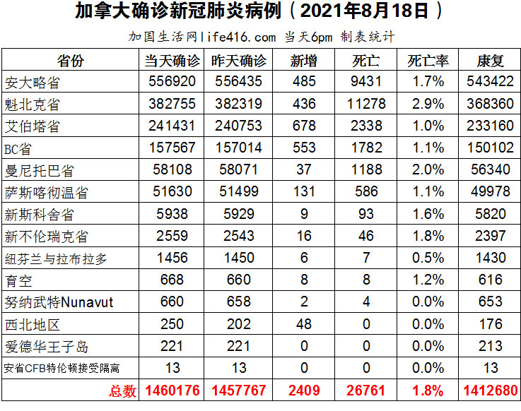 【加国生活网编译报道】截至2021年8月18日下午6点,加拿大新冠确诊病例总数为1460176(新增2409),死亡26761(新增42)。安省确诊总数556920(新增485);魁省确诊总数382755(新增436)、艾省确诊总数241431(新增678)、BC省确诊总数157567(新增553);曼省确诊总数58108(新增37);萨省确诊总数51630(新增131)。安省目前的疫苗接种工作并不乐观,随着Delta变异病毒的发病率上升,疫苗接种率却在下降,平均每天新接种的疫苗数量似乎稳定在4.3万左右,而delta变异病毒的确诊病例占所有确诊病例的90%以上,与新冠的斗争尚未结束。加国生活网专门制作了如下统计数据表: