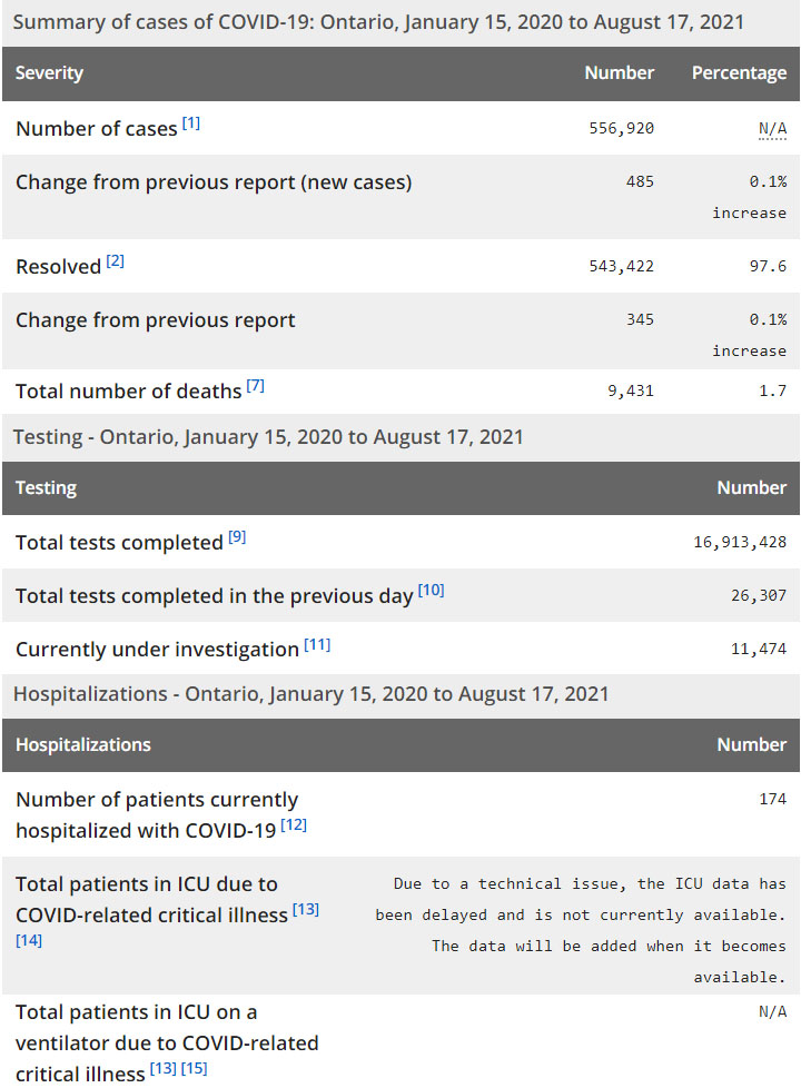 8月16日:安省连续五天超过500例67%未接种疫苗 连续三天创零死亡记录