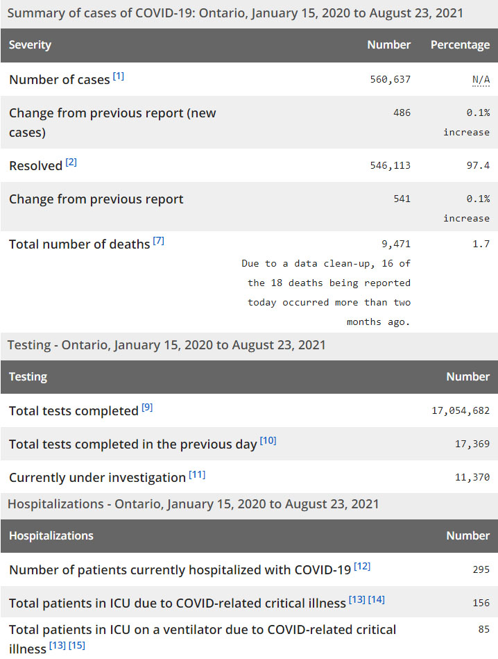8月16日:安省连续五天超过500例67%未接种疫苗 连续三天创零死亡记录