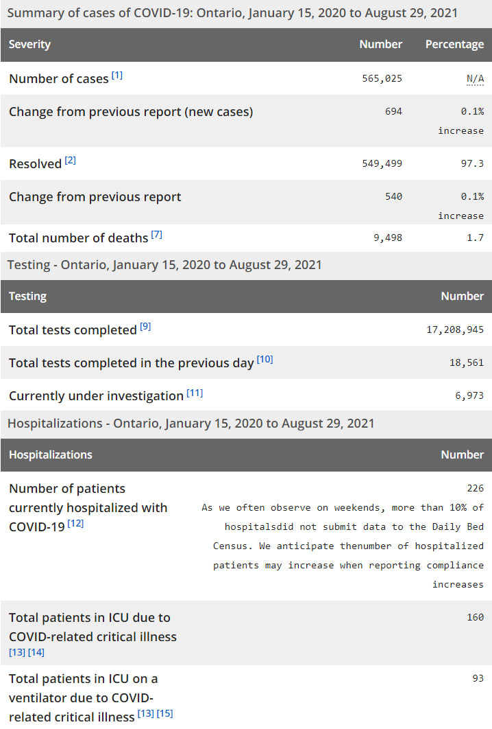在当天的694例病例中,有527(76%)是属于未接种疫苗、只接种一剂疫苗或未告知疫苗接种状态,另外167例(24%)属于已接种了两剂疫苗。截至8月30日晚8点,12岁及以上的安省省民中,83.535%接种了一剂疫苗,76.734%接种了两剂疫苗。