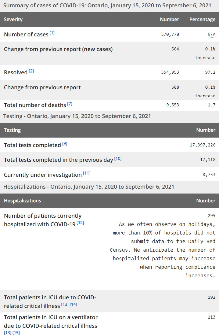 再看看安省方面的详细数据,截止9月6日,安省已对17,397,226例进行了新冠病毒检测(检测数较昨天新增17,118),还有8,733处于被调查阶段。确诊总数570,778(当天新增564;阳性率下降至3.29%),包括554,953例康复(康复率仍为97.2%)、9,553例死亡(新增5例,死亡率仍为1.7%)。住院患者295例(增加29,有10%医院在周末没有提交数据);进入ICU患者192例(增加13);IU插呼吸机患者113(增加9)。