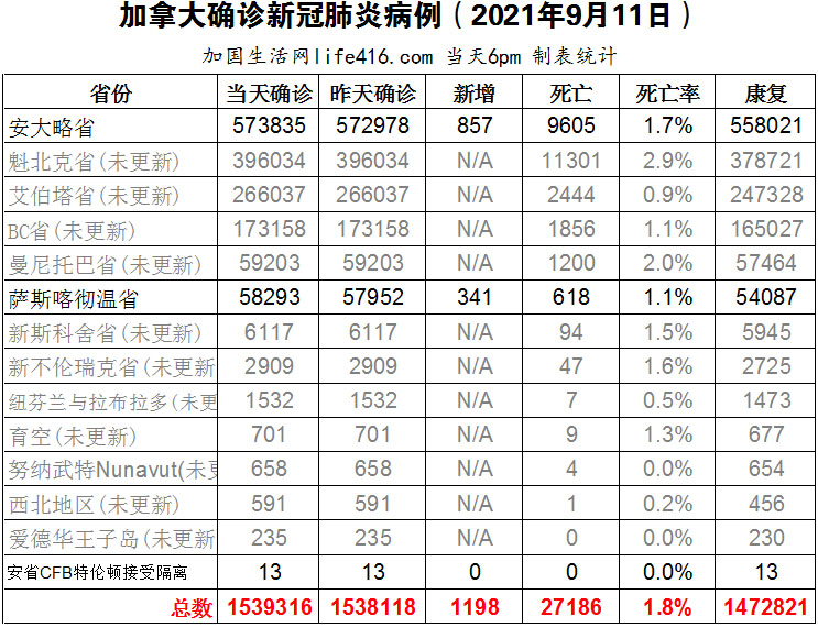 【加国生活网编译报道】截至2021年9月11日下午6点,加拿大新冠确诊病例总数为1539316(新增1198),死亡27186(新增16)。安省确诊总数573835(新增857);萨省确诊总数58293(新增341);其余省份逢周末均未更新。根据加拿大在9月10日发布的最新数据显示,从7月下旬到8月下旬,未接种疫苗的人群的住院风险是完全接种疫苗人群的36倍。专家认为一些免疫力低的完全接种疫苗的人群容易发生突破性感染,其演变成重症的机率与感染任何病毒后演变成重症的机率是一样的。加国生活网专门制作了如下统计数据表: