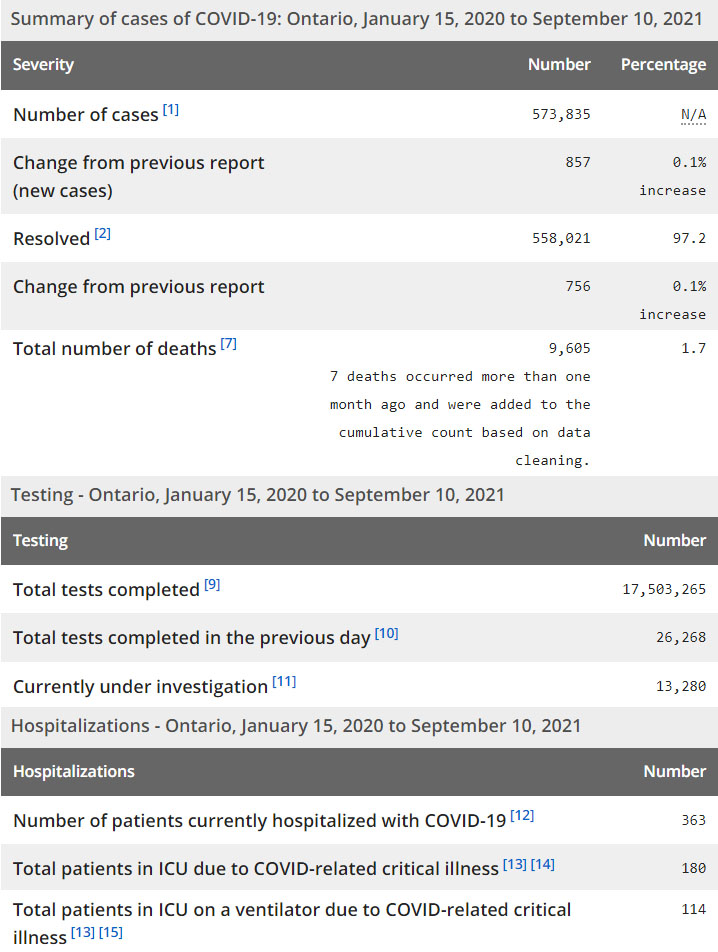 再看看安省方面的详细数据,截止9月10日,安省已对17,503,265例进行了新冠病毒检测(检测数较昨天新增26,268),还有13,280处于被调查阶段。确诊总数573,835(当天新增857;阳性率上升至3.26%),包括558,021例康复(康复率下降为97.2%)、9,605例死亡(新增15例,其中7例为1个多月前的历史遗漏数据,死亡率仍为1.7%)。住院患者363例(增加2);进入ICU患者180例(增加3);IU插呼吸机患者114(增加1)。
