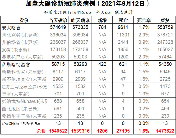 【加国生活网编译报道】截至2021年9月12日下午6点,加拿大新冠确诊病例总数为1540522(新增1206),死亡27195(新增9)。安省确诊总数574619(新增784);萨省确诊总数58715(新增422);其余省份逢周末均未更新。开学的第一周,加拿大各地爆发了几次疫情,导致学校停课和课程取消;安省在9月12日新增784例确诊病例,比9月11日的857例有所减少,23%属于完全接种疫苗。加国生活网专门制作了如下统计数据表: