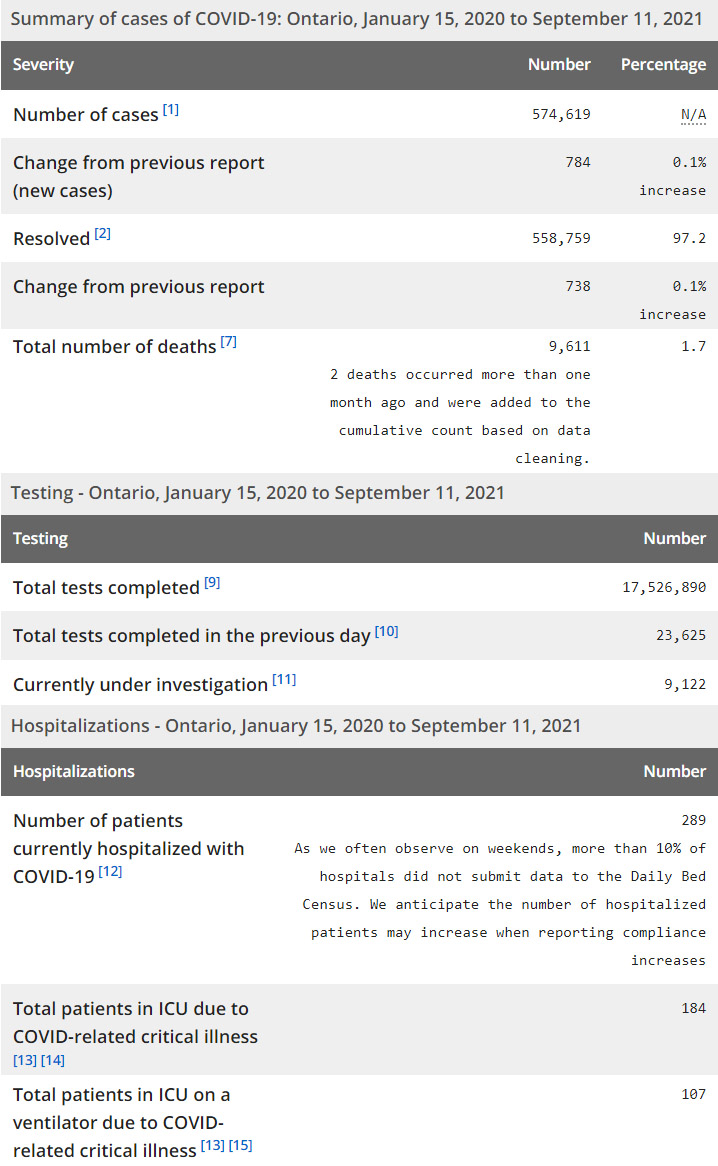 —— 安省在9月12日新增784例确诊病例(比9月11日的857例有所减少),其中有602例(77%)是属于未接种疫苗、只接种一剂疫苗或未告知疫苗接种状态,另外182例(23%)属于已接种了两剂疫苗。从地区来看,多伦多147例、温莎73例、皮尔区67例、约克区65例、哈密尔顿57例、渥太华57例。截至9月12日晚5点,12岁及以上的安省省民中,85.037%接种了一剂疫苗,78.64%接种了两剂疫苗。当天还新增6例死亡病例,将官方死亡人数推高至9,611。