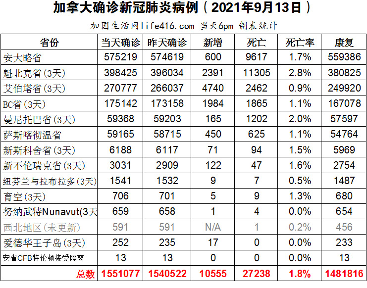【加国生活网编译报道】截至2021年9月13日下午6点,加拿大新冠确诊病例总数为1551077(3天新增10555,当天新增4062),死亡27238(3天新增43)。安省确诊总数575219(新增600);魁省确诊总数398425(3天新增2391,当天新增639)、艾省确诊总数270777(3天新增4740,当天新增1584)、BC省确诊总数175142(3天新增1984,当天新增520);曼省确诊总数59368(3天新增165,当天新增41);萨省确诊总数59165(新增450)。加拿大连续两个周末新增确诊病例过万,这其中艾省(Alberta省)新增确诊病例数最多;BC省卫生部宣布该省所有卫生保健工作者必须接种疫苗;专家认为新变种出现的速度呈下降趋势。加国生活网专门制作了如下统计数据表: