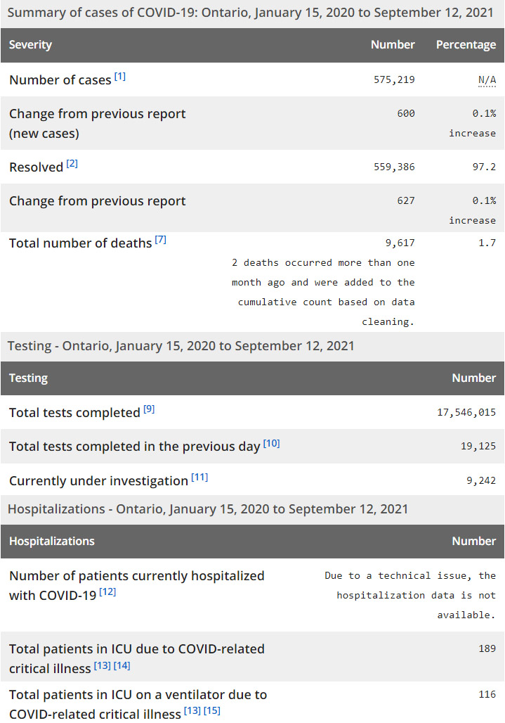 再看看安省方面的详细数据,截止9月12日,安省已对17,546,015例进行了新冠病毒检测(检测数较昨天新增19,125),还有9,242处于被调查阶段。确诊总数575,219(当天新增600;阳性率下降至3.14%),包括559,386例康复(康复率仍为97.2%)、9,617例死亡(新增6例,其中2例为1个多月前的历史遗漏数据,死亡率仍为1.7%)。住院患者289例(因技术错误当天没有更新);进入ICU患者189例(增加5);IU插呼吸机患者116(增加9)。