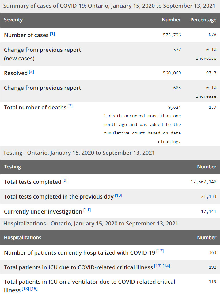 再看看安省方面的详细数据,截止9月13日,安省已对17,567,148例进行了新冠病毒检测(检测数较昨天新增21,133),还有17,141处于被调查阶段。确诊总数575,796(当天新增577;阳性率下降至2.73%),包括560,069例康复(康复率上升为97.3%)、9,624例死亡(新增7例,其中1例为1个多月前的历史遗漏数据,死亡率仍为1.7%)。住院患者363例(增加74);进入ICU患者192例(增加3);IU插呼吸机患者119(增加3)。