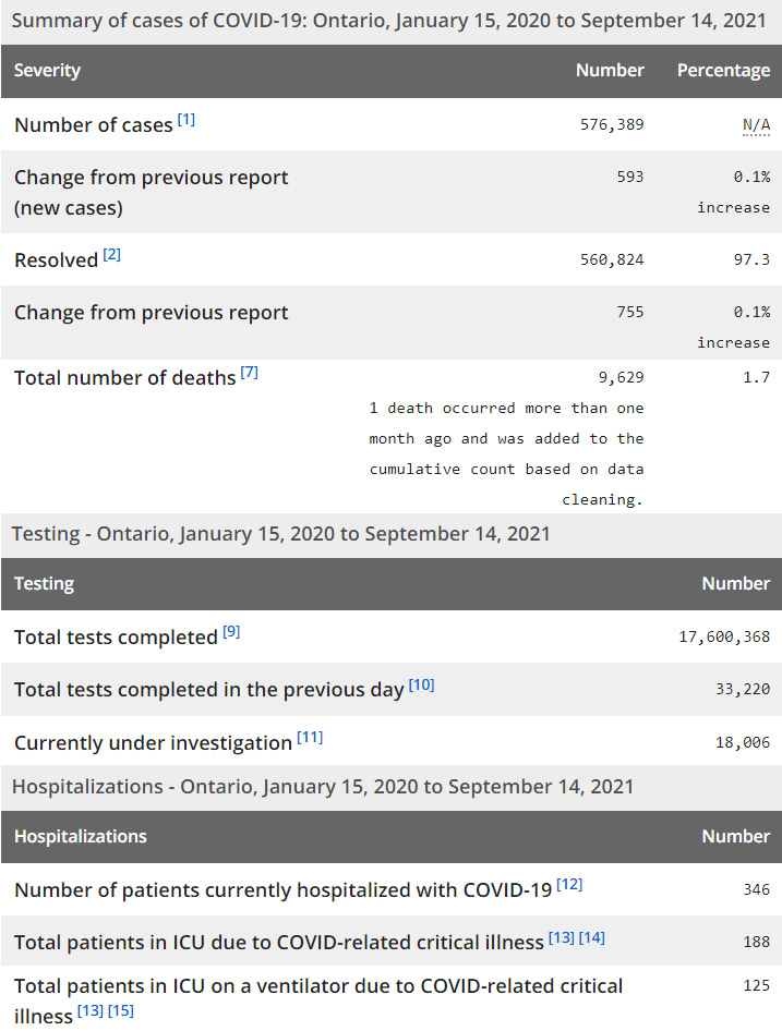 再看看安省方面的详细数据,截止9月14日,安省已对17,600,368例进行了新冠病毒检测(检测数较昨天新增33,220),还有18,006处于被调查阶段。确诊总数576,389(当天新增593;阳性率下降至1.79%),包括560,824例康复(康复率仍为97.3%)、9,629例死亡(新增5例,其中1例为1个多月前的历史遗漏数据,死亡率仍为1.7%)。住院患者346例(减少17);进入ICU患者188例(减少4);IU插呼吸机患者125(增加6)。
