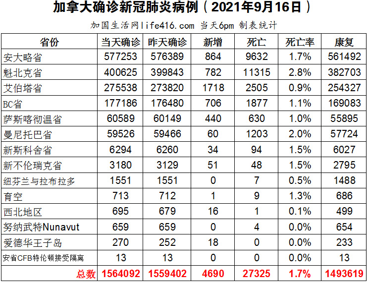 【加国生活网编译报道】截至2021年9月16日下午6点,加拿大新冠确诊病例总数为1564092(新增4690),死亡27325(新增20)。安省确诊总数577253(新增864);魁省确诊总数400625(新增782)、艾省确诊总数275538(新增1718)、BC省确诊总数177186(新增706);萨省确诊总数60589(新增440);曼省确诊总数59526(新增60)。加拿大首席公共卫生官认为其他省份应从艾省和萨省的疫情危机中吸取教训;艾省医疗系统已经超负荷运转,作为最后手段,一些患者甚至可能被转移到安省;萨省疫情正在上升,将实施强制性口罩、疫苗接种政策证明以及政府雇员接种疫苗或接受阴性检测的卫生限制措施。加国生活网专门制作了如下统计数据表: