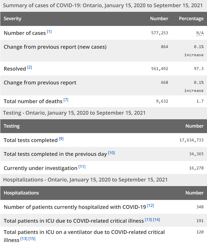 再看看安省方面的详细数据,截止9月15日,安省已对17,634,733例进行了新冠病毒检测(检测数较昨天新增34,365),还有16,278处于被调查阶段。确诊总数577,253(当天新增864;阳性率上升至2.51%),包括561,492例康复(康复率仍为97.3%)、9,632例死亡(新增3例,死亡率仍为1.7%)。住院患者348例(增加2);进入ICU患者191例(增加3);IU插呼吸机患者120(减少5)。