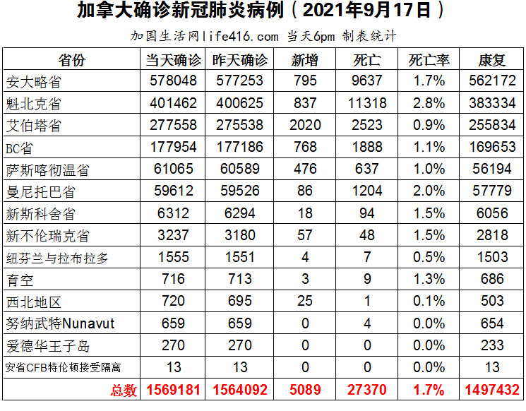 【加国生活网编译报道】截至2021年9月17日下午6点,加拿大新冠确诊病例总数为1569181(新增5089),死亡27370(新增45)。安省确诊总数578048(新增795);魁省确诊总数401462(新增837)、艾省确诊总数277558(新增2020)、BC省确诊总数177954(新增768);萨省确诊总数61065(新增476);曼省确诊总数59612(新增86)。再见辉瑞,你好Comirnaty!加拿大卫生部批准的三款疫苗改名;艾省新增确诊病例突破2千,在省长宣布实施“疫苗护照”后的第二天,艾省新冠疫苗的需求量增加了两倍。加国生活网专门制作了如下统计数据表: