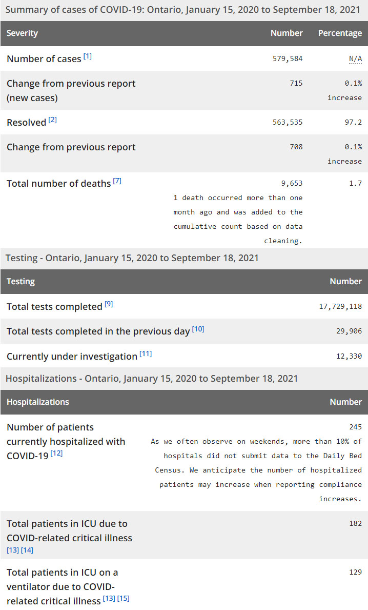 再看看安省方面的详细数据,截止9月18日,安省已对17,729,118例进行了新冠病毒检测(检测数较昨天新增29,906),还有12,330处于被调查阶段。确诊总数579,584(当天新增715;阳性率下降至2.39%),包括563,535例康复(康复率仍为97.2%)、9,653例死亡(新增6例,其中1例是1个多月前的遗漏数据,死亡率仍为1.7%)。住院患者245例(减少84,周末有10%医院没有更新数据);进入ICU患者182例(减少3);IU插呼吸机患者129(增加3)。