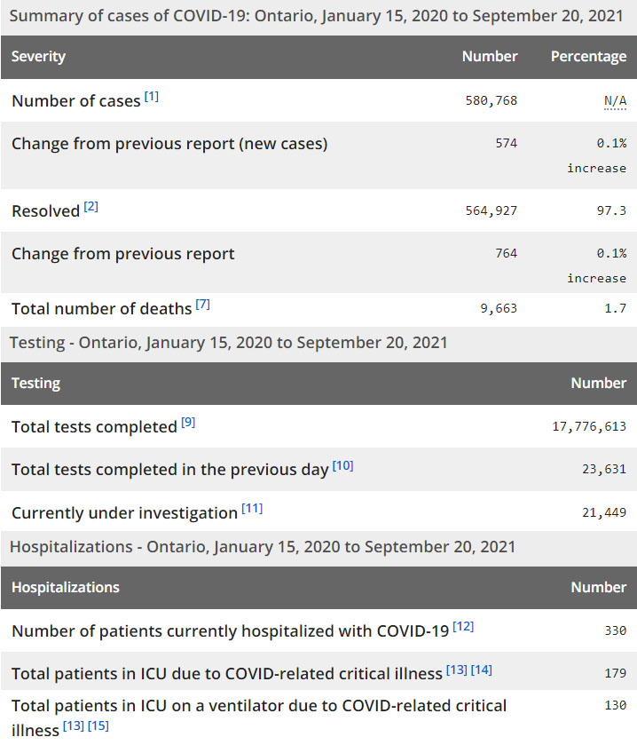 再看看安省方面的详细数据,截止9月20日,安省已对17,776,613例进行了新冠病毒检测(检测数较昨天新增23,631),还有21,449处于被调查阶段。确诊总数580,768(当天新增574;阳性率下降至2.43%),包括564,927例康复(康复率上升为97.3%)、9,663例死亡(新增8例,死亡率仍为1.7%)。住院患者330例(增加97);进入ICU患者179例(增加2);IU插呼吸机患者130(增加7)。