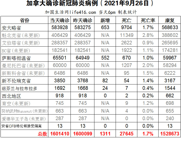 【加国生活网编译报道】截至2021年9月26日下午6点,加拿大新冠确诊病例总数为1601410(新增1311),死亡27645(新增10)。安省确诊总数583928(新增653);萨省确诊总数65501(新增552);新不伦瑞克省确诊总数3850(新增82),其余新增确诊病例“大户”省份逢周末均未更新。安省目前每天确诊病例数低于许多专家的预期,虽然安省疫情形势相对乐观,但专家们表示现在还不是放松卫生措施的时候,因为疫情随时会逆转。加国生活网专门制作了如下统计数据表: