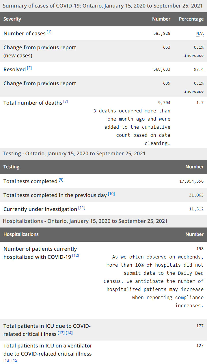 再看看安省方面的详细数据,截止9月25日,安省已对17,954,556例进行了新冠病毒检测(检测数较昨天新增31,063),还有11,512处于被调查阶段。确诊总数583,928(当天新增653;阳性率上升至2.1%),包括568,633例康复(康复率仍为97.4%)、9,704例死亡(新增6例,其中3例为1个多月前的遗漏数据,死亡率仍为1.7%)。住院患者198例(减少125,周末有10%医院未更新数据);进入ICU患者177例(减少1);IU插呼吸机患者127(减少1)。