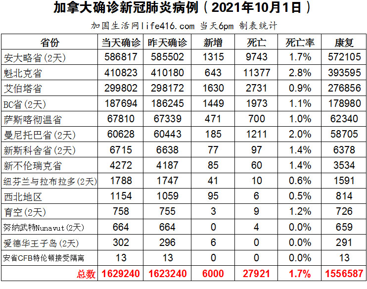 【加国生活网编译报道】截至2021年10月1日下午6点,加拿大新冠确诊病例总数为1629240(2天新增6000,当天新增4231),死亡27921(新增68)。安省确诊总数586817(2天新增1315,当天新增668);魁省确诊总数410823(新增643);艾省确诊总数299802(新增1630);BC省确诊总数187694(2天新增1449,当天新增700);萨省确诊总数67810(新增471);曼省确诊总数60628(2天新增185,当天新增78)。随着秋季流感季节的开始以及更具传染性的Delta变异病毒仍是主要毒株,许多加拿大人怀疑未来几个月的疫情可能会更糟糕。不过,一些流行病学家和传染病专家则表达了谨慎的乐观态度,CBC为此总结了专家提出的对疫情发展有关的几点因素。加国生活网专门制作了如下统计数据表: