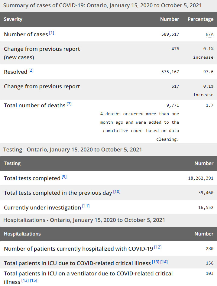 再看看安省方面的详细数据,截止10月5日,安省已对18,262,391例进行了新冠病毒检测(检测数较昨天新增39,460),还有16,552处于被调查阶段。确诊总数589,517(当天新增476;阳性率下降至1.21%),包括575,167例康复(康复率上升为97.6%)、9,771例死亡(新增14例,其中4例为1个多月前的遗漏数据,死亡率仍为1.7%)。住院患者280例(增加3);进入ICU患者156例(增加1);IU插呼吸机患者103(增加2)。