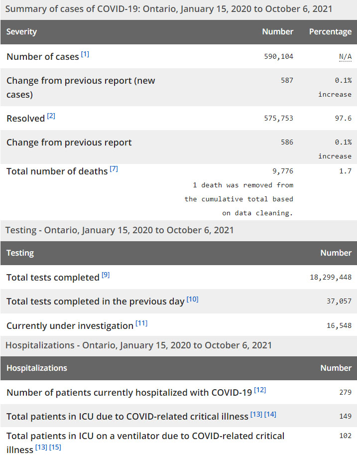 再看看安省方面的详细数据,截止10月6日,安省已对18,299,448例进行了新冠病毒检测(检测数较昨天新增37,057),还有16,548处于被调查阶段。确诊总数590,104(当天新增587;阳性率上升至1.58%),包括575,753例康复(康复率仍为97.6%)、9,776例死亡(新增5例,死亡率仍为1.7%)。住院患者279例(减少1);进入ICU患者149例(减少7);IU插呼吸机患者102(减少1)。