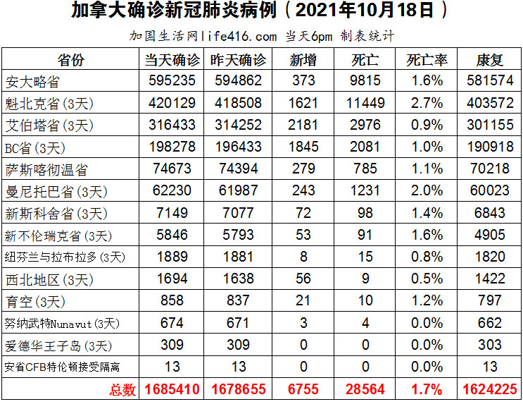 【加国生活网编译报道】截至2021年10月18日下午6点,加拿大新冠确诊病例总数为1685410(3天新增6755,当天新增2371),死亡28564(3天新增78)。安省确诊总数595235(新增373);魁省确诊总数420129(3天新增1621,当天新增410);艾省确诊总数316433(3天新增2181,当天新增607);BC省确诊总数198278(3天新增1845,当天新增443);萨省确诊总数74673(新增279);曼省确诊总数62230(3天新增243,当天新增51)。安省增强型疫苗证书下载攻略(含二维码);辉瑞正式向加拿大卫生部申请批准用于5至11岁儿童的新冠疫苗。加国生活网专门制作了如下统计数据表: