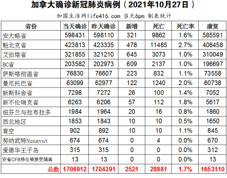 【加国生活网编译报道】截至2021年10月27日下午6点,加拿大新冠确诊病例总数为1706912(新增2521),死亡28881(新增40)。安省确诊总数598431(新增321);魁省确诊总数423813(新增478);艾省确诊总数321855(新增645);BC省确诊总数203582(新增609);萨省确诊总数76830(新增223);曼省确诊总数63099(新增122)。BC省最新预测模型显示其疫情“基本稳定”,每日新增确诊病例数正在以2%的速度下降,预计未来几周将继续下降;安省省长福特表示,当涉及到5至11岁孩子是否要接种疫苗时,他理解父母们的犹豫;安省新冠科学组发布了有关如何增加儿童和青少年疫苗接种的推荐策略;安省新增321例病例,37%属于已接种了两剂疫苗。加国生活网专门制作了如下统计数据表: