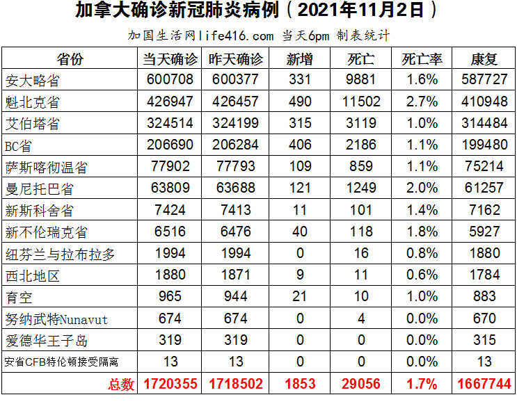 【加国生活网编译报道】截至2021年11月2日下午6点,加拿大新冠确诊病例总数为1720355(新增1853),死亡29056(新增33)。安省确诊总数600708(新增331);魁省确诊总数426947(新增490);艾省确诊总数324514(新增315);BC省确诊总数206690(新增406);萨省确诊总数77902(新增109);曼省确诊总数63809(新增121)。加拿大交通部长宣布11月30日将有另外8个机场开始接待国际旅客,使向全球旅客开放的加拿大机场总数达到18个;安省每日新增确诊病例连续两天周环比增长20%以上,当天新增病例有41%属于已接种了两剂疫苗;美国CDC终于最终批准辉瑞疫苗用于5至11岁儿童,加拿大还在审核中。加国生活网专门制作了如下统计数据表: