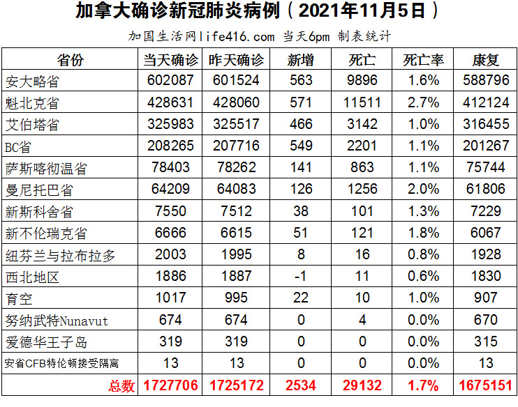 【加国生活网编译报道】截至2021年11月5日下午6点,加拿大新冠确诊病例总数为1727706(新增2534),死亡29132(新增17)。安省确诊总数602087(新增563);魁省确诊总数428631(新增571);艾省确诊总数325983(新增466);BC省确诊总数208265(新增549);萨省确诊总数78403(新增141);曼省确诊总数64209(新增126)。加拿大公共卫生局表示,虽然加拿大正在扭转“第四波”疫情的曲线,但在未来几个月内的疫情曲线仍可能出现一些“颠簸”,其中12岁以下儿童疫情暴发;安省新增563例确诊病例,这标志着每日新增确诊病例数连续第五天周环比增加,完全疫苗突破性感染升至44%。加国生活网专门制作了如下统计数据表: