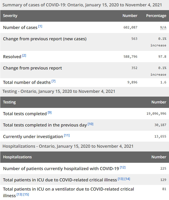再看看安省方面的详细数据,截止11月4日,安省已对19,096,996例进行了新冠病毒检测(检测数较昨天新增30,187),还有13,655处于被调查阶段。确诊总数602,087(当天新增563;阳性率上升至1.87%),包括588,796例康复(康复率仍为97.8%)、9,896例死亡(增加5例,死亡率仍为1.6%)。住院患者225例(减少9例);进入ICU患者129例(减少1);IU插呼吸机患者81(减少4)。