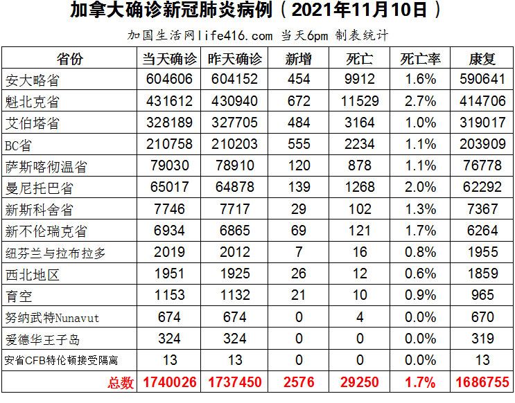 随着Delta变异病毒在社区内传播,再加上各省和地区的卫生限制措施有所放松,“第四波”疫情终于在加拿大开始爆发了。加国生活网小编专门统计了从2020年11月11日至2021年11月10日的五个省份的新增确诊数,并制作了如下曲线图,让大家能一目了然地了解加拿大新冠疫情的发展趋势。加拿大当日新增2576例,按新增确诊数由多至少的排列分别是:魁省新增672、BC省新增555、艾省新增484、安省新增454、曼省新增139、萨省新增120。