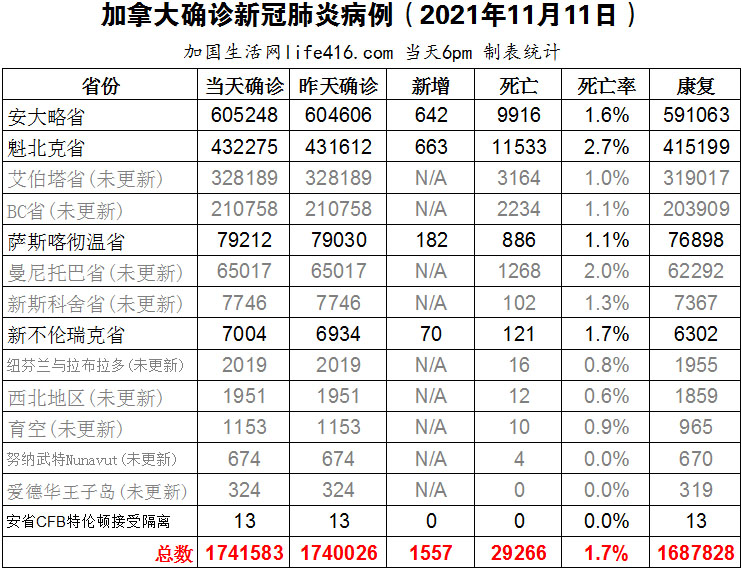 【加国生活网编译报道】由于11月11日是加拿大Remembrance Day,加拿大好多省份没有更新数据。截至2021年11月11日下午6点,加拿大新冠确诊病例总数为1741583(新增1557),死亡29266(新增16)。安省确诊总数605248(新增642);魁省确诊总数432275(新增663);萨省确诊总数79212(新增182)。安省新增642例确诊病例,创一个月以来的最高记录,连续七天平均值为532例,比一周前的383例显著增涨;安省教育部决定于2022年9月升入9年级的学生将不再选修读应用或学术课程。加国生活网专门制作了如下统计数据表: