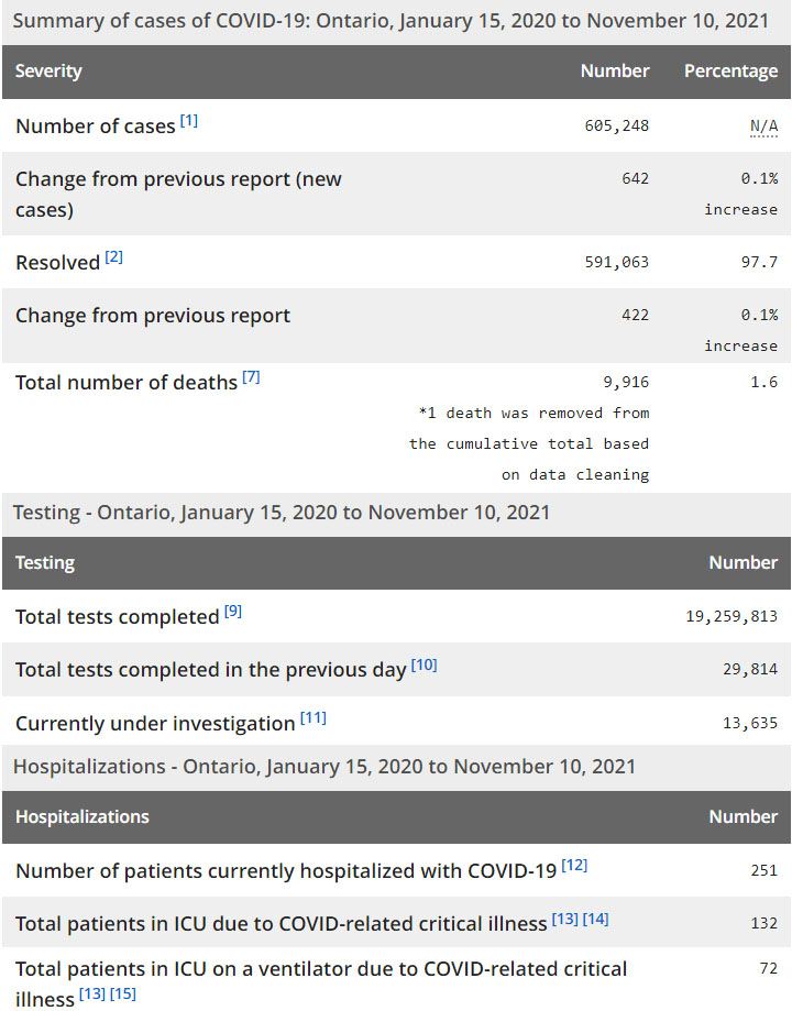再看看安省方面的详细数据,截止11月10日,安省已对19,259,813例进行了新冠病毒检测(检测数较昨天新增29,814),还有13,635处于被调查阶段。确诊总数605,248(当天新增642;阳性率上升至2.15%),包括591,063例康复(康复率仍为97.7%)、9,916例死亡(增加4例,死亡率仍为1.6%)。住院患者251例(增加8);进入ICU患者132例(减少4);IU插呼吸机患者72(减少2)。