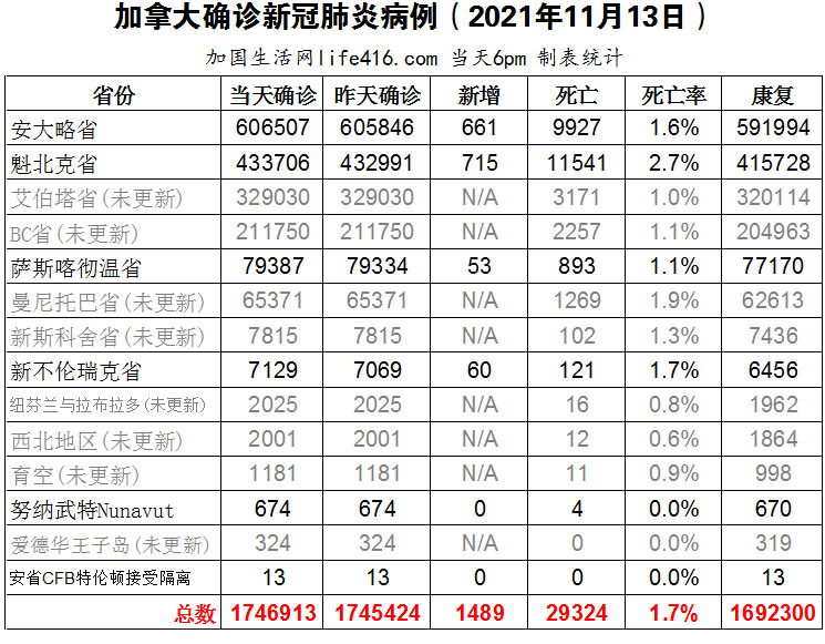 【加国生活网编译报道】截至2021年11月13日下午6点,加拿大新冠确诊病例总数为1746913(新增1489),死亡29324(新增21)。安省确诊总数606507(新增661);魁省确诊总数433706(新增715);萨省确诊总数79387(新增53);新不伦瑞克省确诊总数7129(新增60);其余省份逢周末不更新数据。最近几周,随着学校确诊病例的不断攀升,许多父母想知道学生何时能够在学校接受快速测试,或者渴望能带回家进行PCR测试;安省新增661例确诊病例,创自10月2日以来的最高病例数。加国生活网专门制作了如下统计数据表: