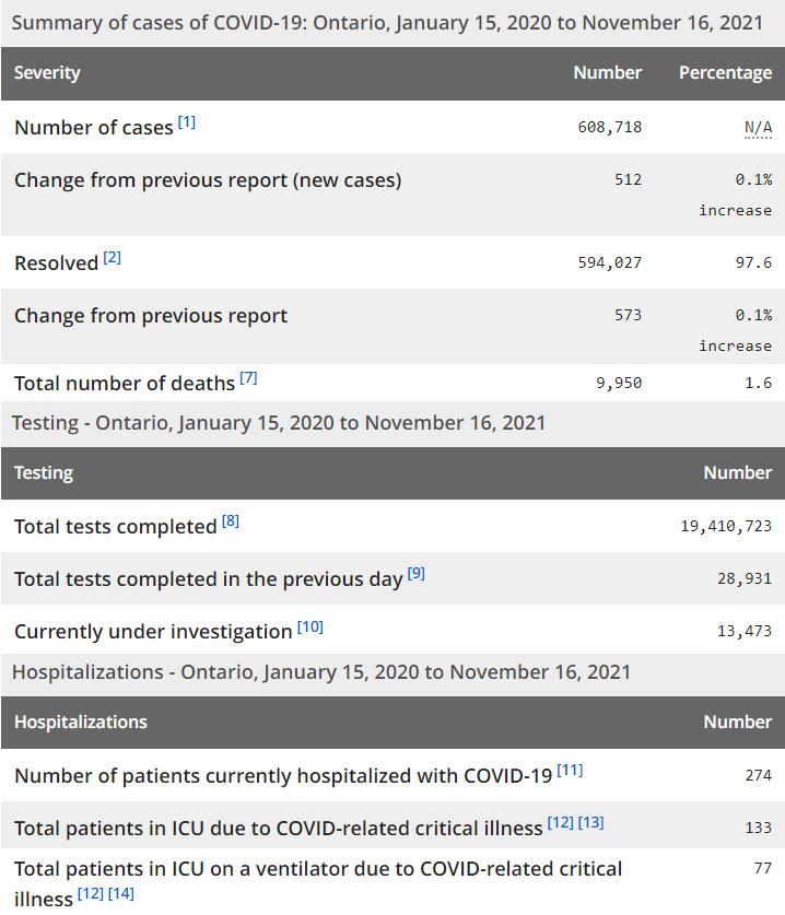 再看看安省方面的详细数据,截止11月16日,安省已对19,410,723例进行了新冠病毒检测(检测数较昨天新增28,931),还有13,473处于被调查阶段。确诊总数608,718(当天新增512;阳性率下降至1.77%),包括594,027例康复(康复率仍为97.6%)、9,950例死亡(增加12例,死亡率仍为1.6%)。住院患者274例(减少27例);进入ICU患者133例(减少6);IU插呼吸机患者77(减少5)。