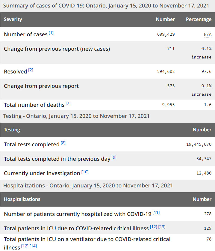 在当天的711例确诊病例中,其中有397例(56%)是属于未接种疫苗、只接种一剂疫苗或未告知疫苗接种状态,另外314例(44%)属于已接种了两剂疫苗。从地区来看,多伦多74例、温莎71例、Simcoe-Muskoka地区67例、渥太华42例、皮尔区40例、约克区39例、滑铁卢37例。截至11月18日晚8点,12岁及以上的安省省民中,88.846%接种了一剂疫苗,85.737%接种了两剂疫苗。