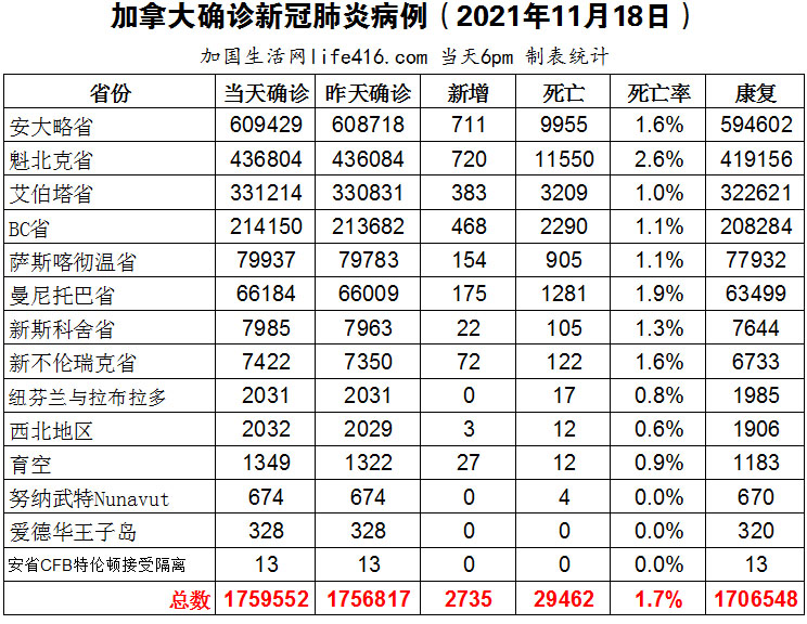 【加国生活网编译报道】截至2021年11月18日下午6点,加拿大新冠确诊病例总数为1759552(新增2735),死亡29462(新增31)。安省确诊总数609429(新增711);魁省确诊总数436804(新增720);艾省确诊总数331214(新增383);BC省确诊总数214150(新增468);萨省确诊总数79937(新增154);曼省确诊总数66184(新增175)。据消息人士称,加拿大卫生部将于周五宣布批准用于5至11岁儿童的辉瑞疫苗;安省正在为更多学校的学生扩大新冠病毒检测选项,包括在寒假期间提供在家快速检测,以及在一些药店为有症状的人提供检测;安省新增711例确诊病例,六周多以来每日新增确诊病例数首次超过700例,也创自9月24日以来单日最高记录。加国生活网专门制作了如下统计数据表: