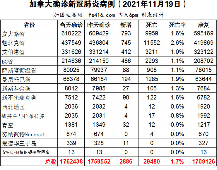 【加国生活网编译报道】截至2021年11月19日下午6点,加拿大新冠确诊病例总数为1762438(新增2886),死亡29480(新增18)。安省确诊总数610222(新增793);魁省确诊总数437549(新增745);艾省确诊总数331626(新增412);BC省确诊总数214636(新增486);萨省确诊总数80025(新增88);曼省确诊总数66378(新增194)。加拿大卫生部正式宣布批准辉瑞儿童疫苗用于5至11岁儿童,各省和地区政府也早已在做好了接种准备;安省在11月19日新增793例确诊病例,创两个多月以来单日最多的病例,尽管安省重症监护室的负担基本保持稳定。加国生活网专门制作了如下统计数据表: