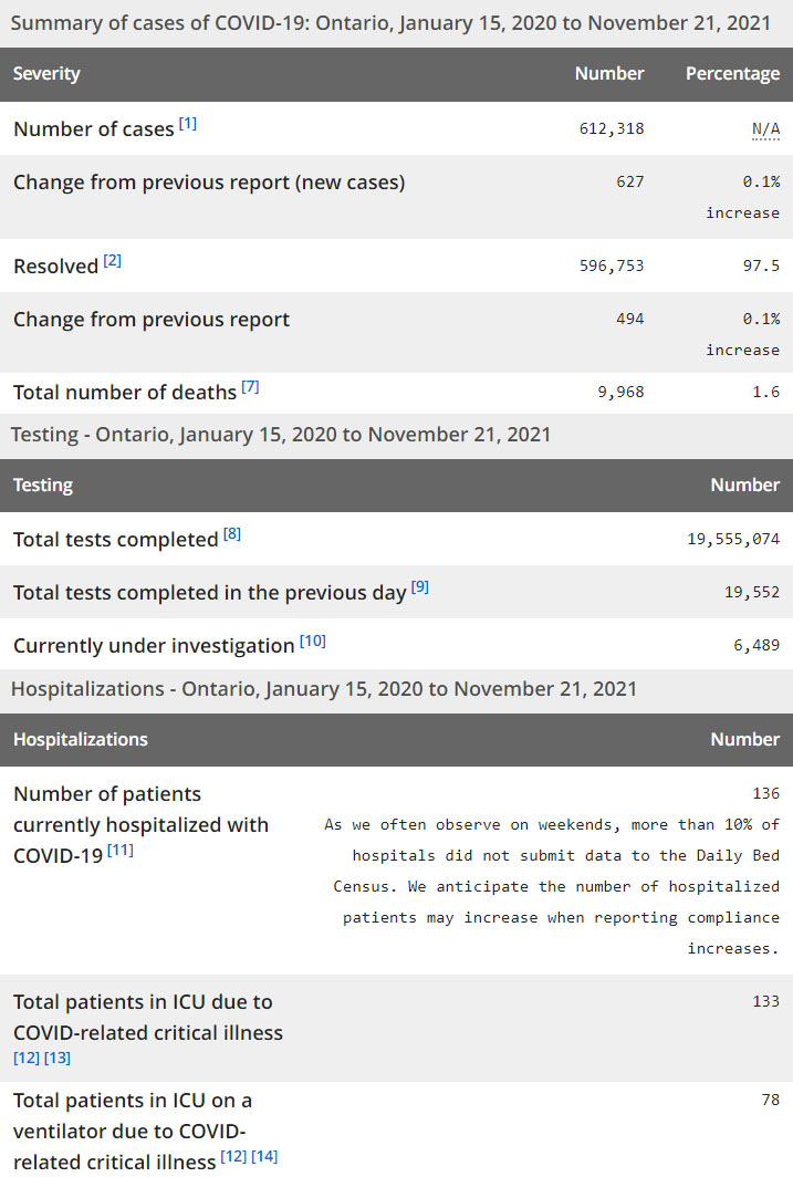 再看看安省方面的详细数据,截止11月21日,安省已对19,555,074例进行了新冠病毒检测(检测数较昨天新增19,552),还有6,489处于被调查阶段。确诊总数612,318(当天新增627;阳性率上升至3.21%),包括596,753例康复(康复率仍为97.5%)、9,968例死亡(增加1例,死亡率仍为1.6%)。住院患者136例(增加29例,有10%医院逢周末没有提交数据);进入ICU患者133例(减少2);IU插呼吸机患者78(减少1)。