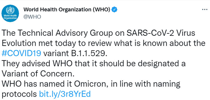 —— 世卫组织SARS-CoV-2病毒进化技术咨询小组于11月26日举行会议,评估新的B.1.1.529变异病毒对公共卫生的潜在风险,并决定是否应将其视为“受关注变异病毒”(variant of concern,简称VOC)或“感兴趣变异病毒”(variant of interest),“受关注的变异病毒”是更严重的名称。最终,SARS-CoV-2 病毒进化技术咨询小组建议世卫组织将B.1.1.529变异病毒认定为“受关注变异病毒”(variant of concern,简称VOC),世卫组织已将B.1.1.529变异病毒命名为omicron。