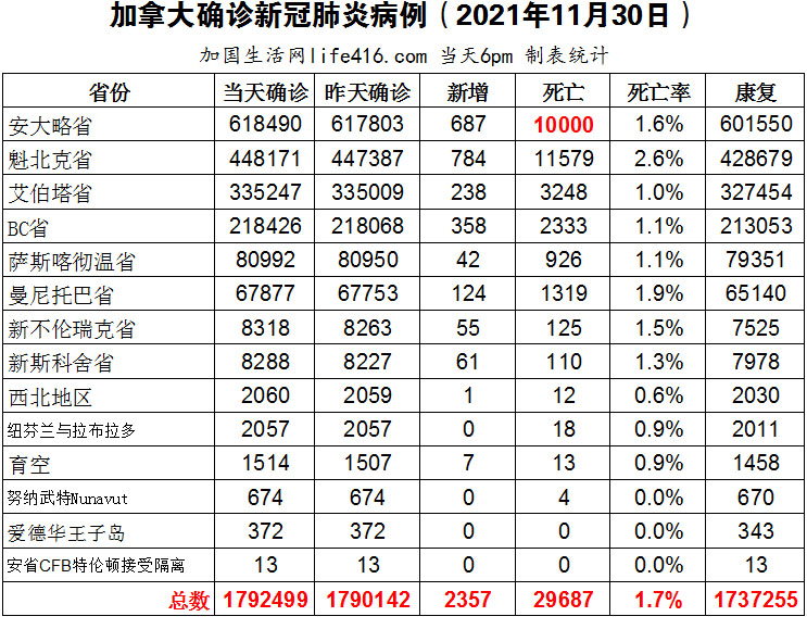 【加国生活网编译报道】截至2021年11月30日下午6点,加拿大新冠确诊病例总数为1792499(新增2357),死亡29687(新增18)。安省确诊总数618490(新增687);魁省确诊总数448171(新增784);艾省确诊总数335247(新增238);BC省确诊总数218426(新增358);萨省确诊总数80992(新增42);曼省确诊总数67877(新增124)。加拿大联邦政府宣布,来自除美国以外的所有国家/地区的航空旅客在抵达加拿大时都必须进行新冠病毒测试并进行隔离;为遏制omicron变异病毒,加拿大将禁飞国家升至10个;从11月30日起,12岁以上未接种疫苗的旅客将无法登上加拿大的飞机或列车;安省自疫情以来的死亡病例正式达到1万例“里程碑”。加国生活网专门制作了如下统计数据表: