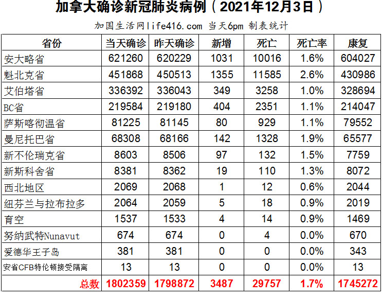 【加国生活网编译报道】截至2021年12月3日下午6点,加拿大新冠确诊病例总数为1802359(新增3487),死亡29757(新增20)。安省确诊总数621260(新增1031);魁省确诊总数451868(新增1355);艾省确诊总数336392(新增349);BC省确诊总数219584(新增404);新不伦瑞克省8603(新增97);萨省确诊总数81225(新增80);曼省确诊总数68308(新增142)。国家免疫咨询委员会NACI“强烈建议”所有50岁以上的加拿大人和其他弱势群体接种第三剂疫苗;安省新增了1,031例确诊病例,创六个月以来单日最高记录;多伦多和约克区均确认发现了omicron 变异病毒病例。加国生活网专门制作了如下统计数据表: