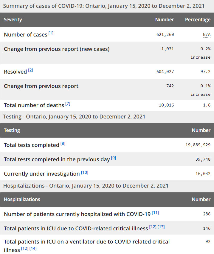 再看看安省方面的详细数据,截止12月2日,安省已对19,889,929例进行了新冠病毒检测(检测数较昨天新增39,748),还有16,032处于被调查阶段。确诊总数621,260(当天新增1031;阳性率上升至2.59%),包括604,027例康复(康复率下降为97.2%)、10,016例死亡(增加4例,死亡率仍为1.6%)。住院患者286例(减少5例);进入ICU患者146例(减少9);IU插呼吸机患者92(增加7)。