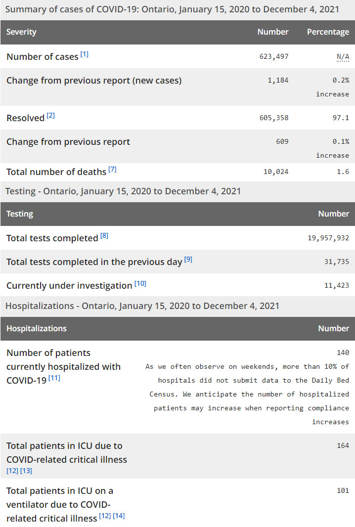 再看看安省方面的详细数据,截止12月4日,安省已对19,957,932例进行了新冠病毒检测(检测数较昨天新增31,735),还有11,423处于被调查阶段。确诊总数623,497(当天新增1184;阳性率上升至3.73%),包括605,358例康复(康复率下降为97.1%)、10,024例死亡(增加0例,死亡率仍为1.6%)。住院患者140例(减少144例,有10%医院逢周末没有提交数据);进入ICU患者164例(增加4);IU插呼吸机患者101(增加3)。