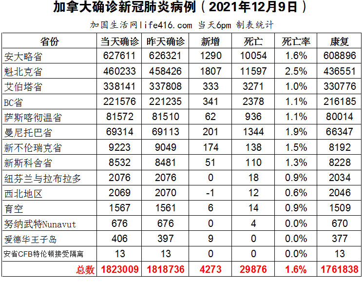 【加国生活网编译报道】截至2021年12月9日下午6点,加拿大新冠确诊病例总数为1823009(新增4273),死亡29876(新增24)。安省确诊总数627611(新增1290);魁省确诊总数460233(新增1807);艾省确诊总数338141(新增333);BC省确诊总数221576(新增341);萨省确诊总数81572(新增62);曼省确诊总数69314(新增201)。安省新增1290例确诊病例,创近六个半月以来单日最高记录,并确诊31例Omicron变异病毒病例;安省疫苗证明系统的结束日期将设为无限期,并要求所有疫苗证书都必须包含二维码;安省新冠科学组建议安省卫生部在达到一定感染水平的学校和工作场所等环境中实施自愿快速检测。加国生活网专门制作了如下统计数据表: