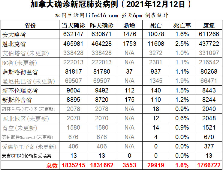【加国生活网编译报道】截至2021年12月12日下午6点,加拿大新冠确诊病例总数为1835215(新增3553),死亡29919(新增9)。安省确诊总数632147(新增1476);魁省确诊总数465981(新增1753);萨省确诊总数81817(新增37);新不伦瑞克省确诊总数9604(新增112);新斯科特省确诊总数8895(新增175);其余省份逢周末没有更新数据。根据加拿大在12月11日所发布的旅行建议,加拿大现在已不再需要从第三国获得的出发前PCR检测呈阴性的报告;随着omicron很快成为主要毒株,专家呼吁安省须立即出台应对策略;安省已确认发现62例Omicron变异病毒确诊病例。加国生活网专门制作了如下统计数据表: