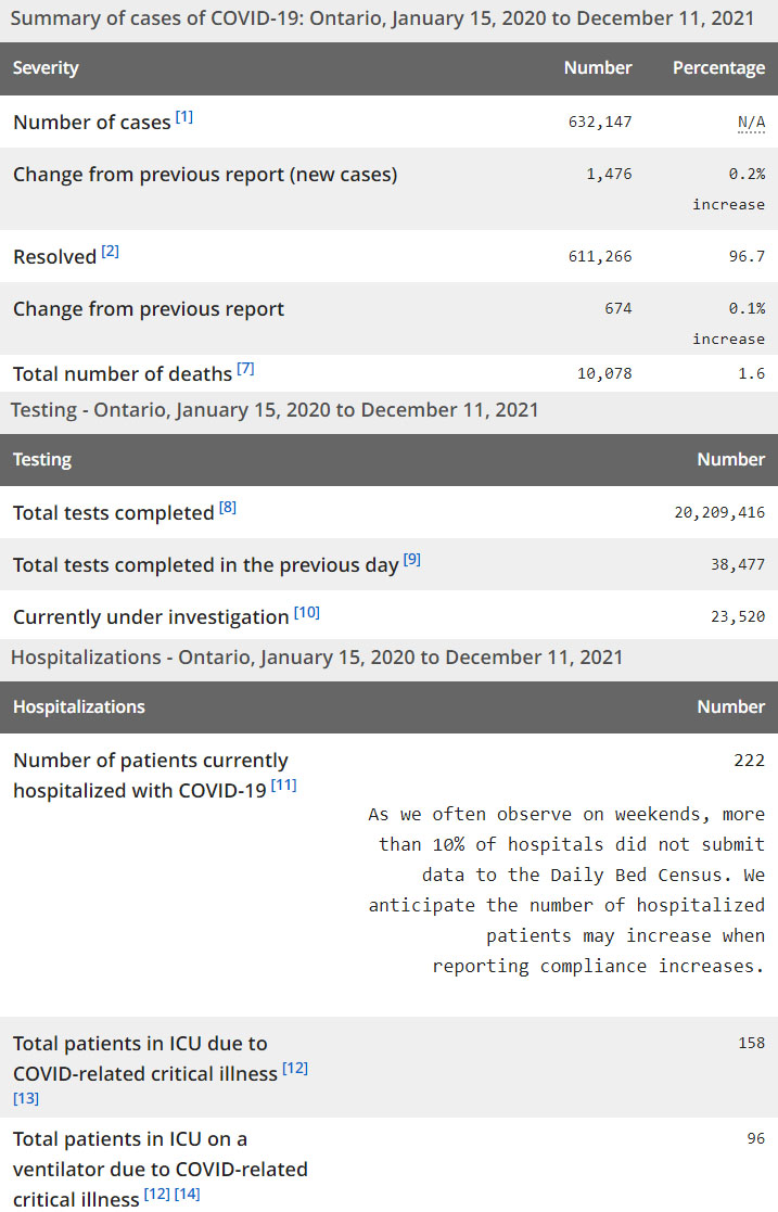 —— 安省在12月12日新增1476例,其中576例属于未接种疫苗、36例属于接种了一剂、771例属于完全接种疫苗、93例属于疫苗接种状态不明。从地区来看,多伦多226例、Kingston地区121例、渥太华98例、皮尔区96例、Simcoe Muskoka地区81例、滑铁卢81例、温莎81例、约克区73例、哈密尔顿67例、Sudbury地区59例、杜兰区53例、霍顿52例、伦敦52例。截至12月13日晚6点,5岁及以上的安省省民中,85.121%接种了一剂疫苗,80.263%接种了两剂疫苗。