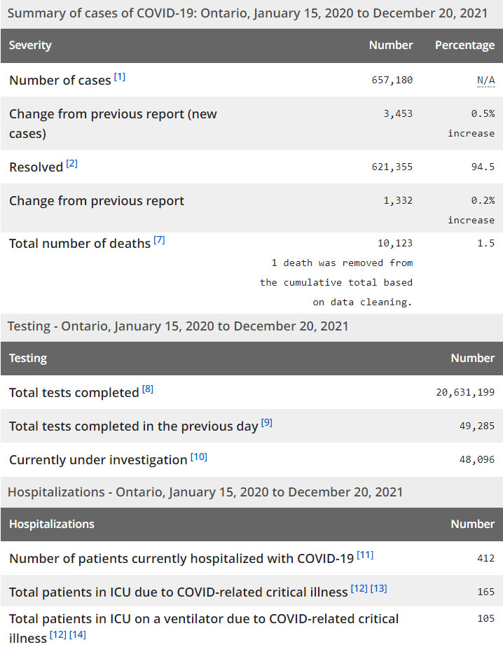 再看看安省方面的详细数据,截止12月20日,安省已对20,631,199例进行了新冠病毒检测(检测数较昨天新增49,285),还有48,096处于被调查阶段。确诊总数657,180(当天新增3,453;阳性率下降至7.01%),包括621,355例康复(康复率下降为94.5%)、10,123例死亡(增加10例,死亡率仍为1.5%)。住院患者412例(增加128);进入ICU患者165例(增加1);IU插呼吸机患者105(减少4)。另:多伦多各个社区的疫情地图请点击这里。