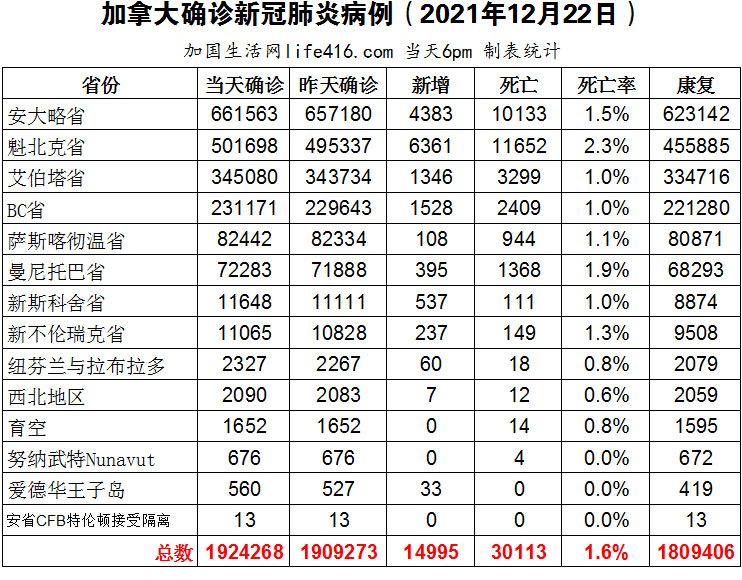 【加国生活网编译报道】截至2021年12月22日下午6点,加拿大新冠确诊病例总数为1924268(新增14995),死亡30113(新增28)。安省确诊总数661563(新增4383);魁省确诊总数501698(新增6361);艾省确诊总数345080(新增1346);BC省确诊总数231171(新增1528);萨省确诊总数82442(新增108);曼省确诊总数72283(新增395);新斯科舍省确诊总数11648(新增537)。加拿大新增14995例确诊病例,三创自疫情以来的最高单日记录;魁省新增6361例确诊病例,目前是加拿大疫情增涨最迅猛的省份;安省新增4383例,91.4%属于omicron确诊病例;随着omicron变异病毒迅速在加拿大各地快速传播,医学界再次探讨应该戴什么样的口罩以及怎样戴口罩的问题。加国生活网专门制作了如下统计数据表: